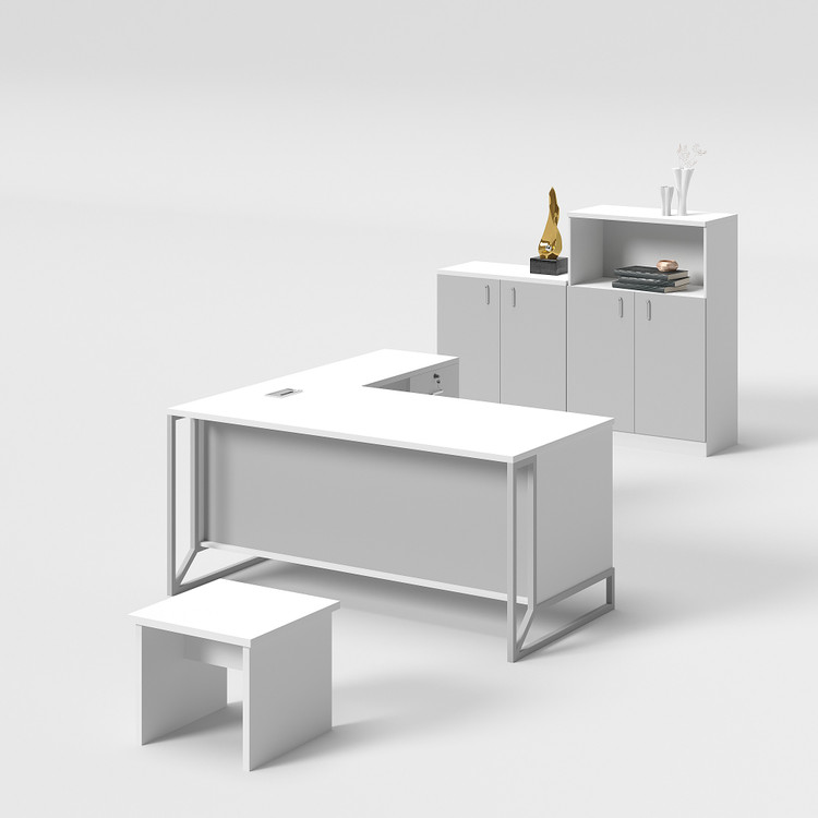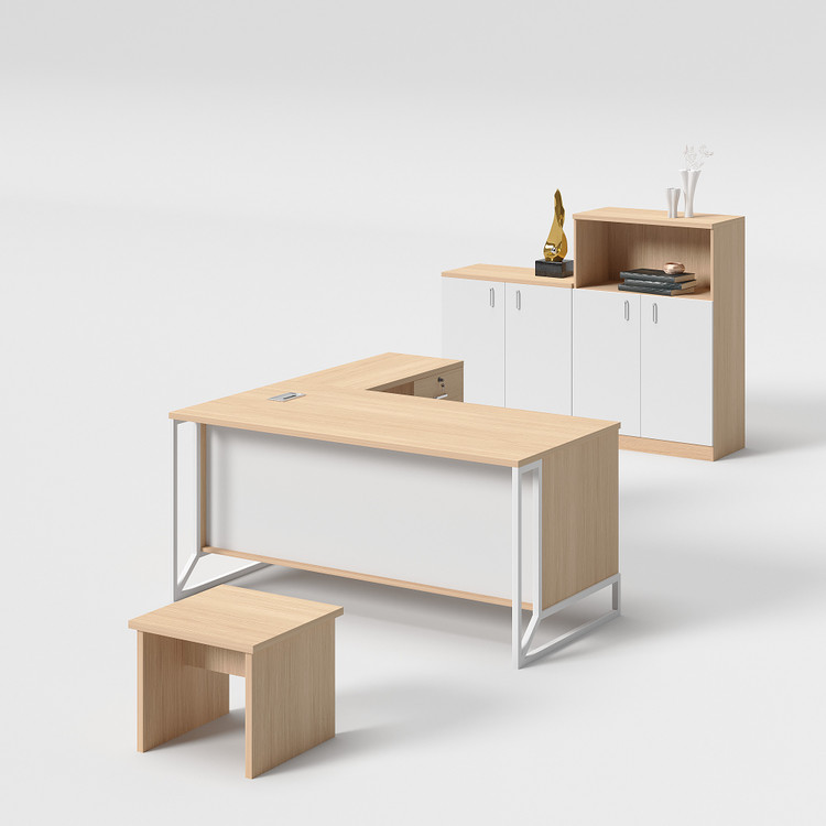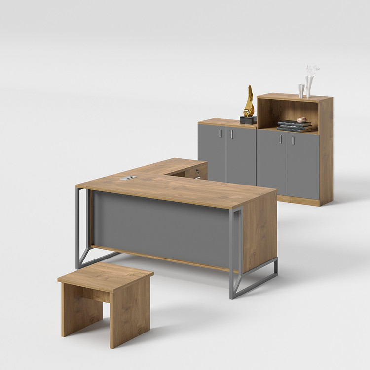 فضای اداری خود را با ست میز اداری L شکل مدرن ما که برای افزایش بهرهوری و سبک طراحی شده است، متحول کنید. این ست شامل یک میز بزرگ، یک میز کنار مبلی و یک کابینت هماهنگ است که همگی ترکیبی هماهنگ از چوب روشن و رنگهای خاکستری تیره دارند.
